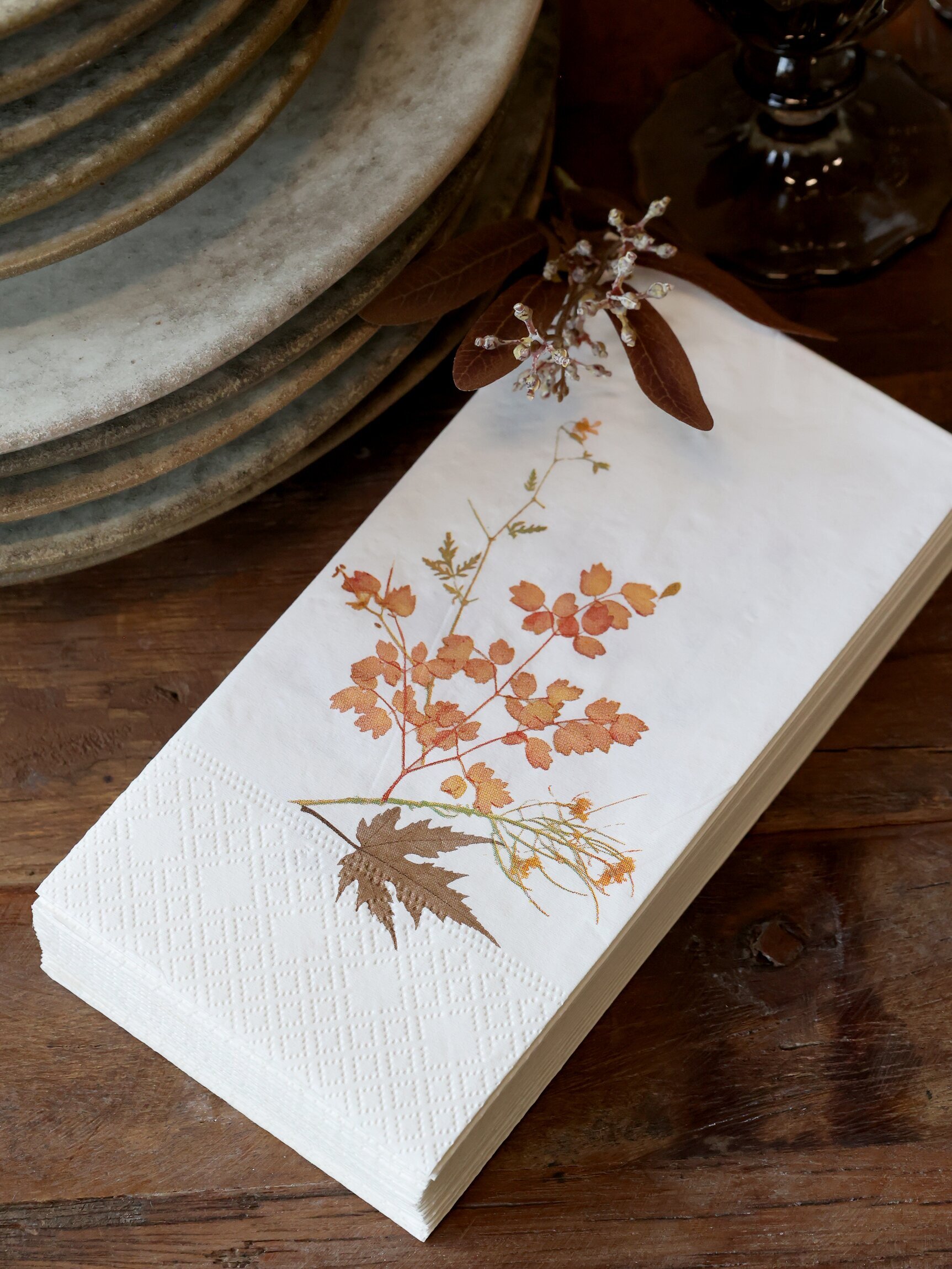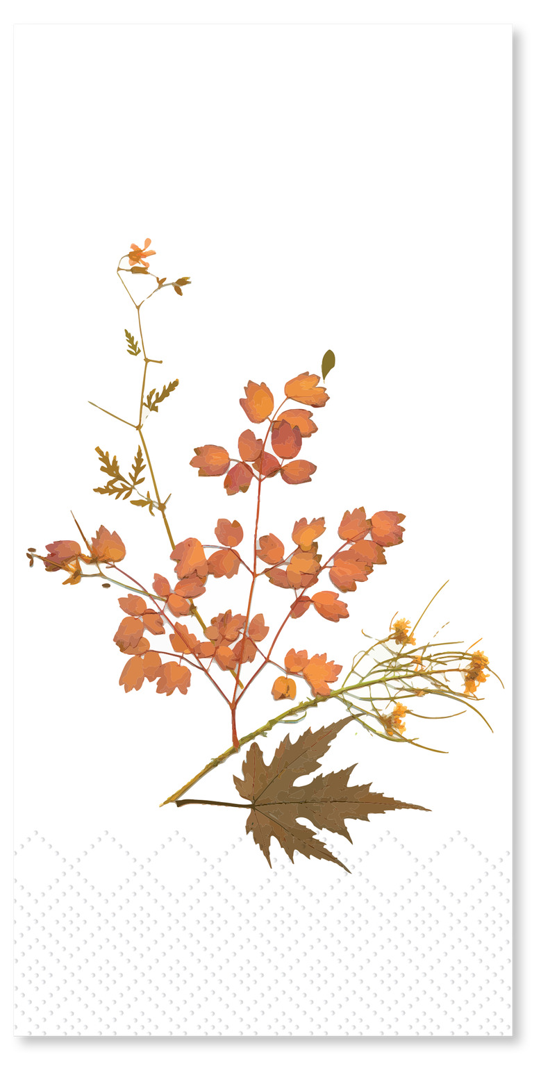 Ge dukningen en varm och naturlig känsla med dessa vackra servetter prydda med ett tryck av torkade höstblad. Perfekta till höstmiddagar, fika eller fest med naturtema. Servetterna är både dekorativa och praktiska, och kommer i ett paket med 16 stycken.