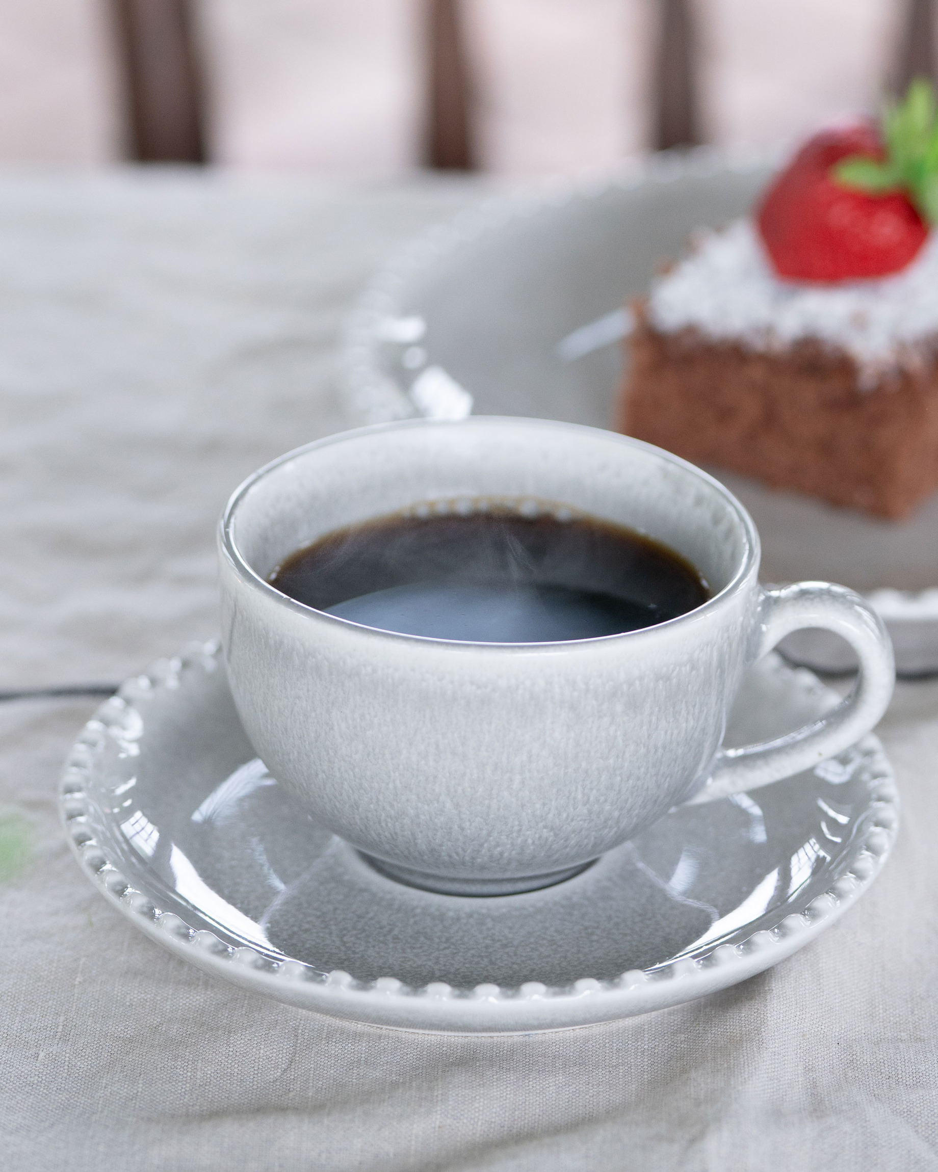 Njut av kaffe eller te i denna vackra kopp med tillhörande fat. Den mjukt beigea glasyren och den dekorativa pärlkanten skapar en elegant känsla som förhöjer varje fikastund.