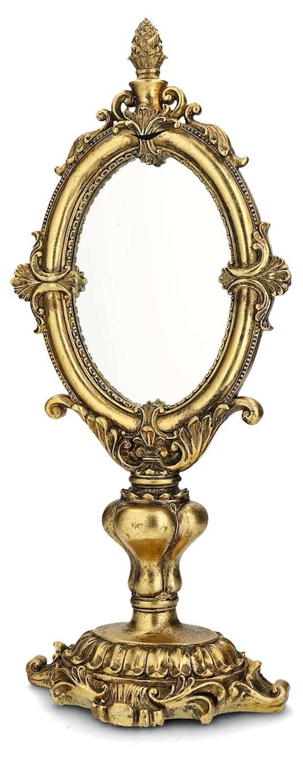 En dekorativ spegel på fot med en vackert utsmyckad ram i klassisk stil. Den guldfärgade finishen och de eleganta detaljerna ger spegeln ett tidlöst och exklusivt uttryck som passar perfekt i både klassiska och romantiska miljöer.