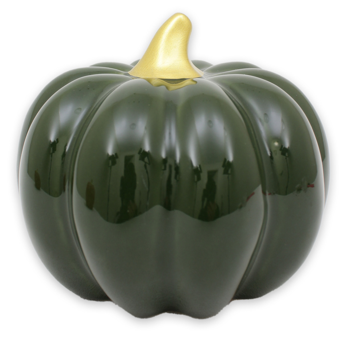 En stilren och dekorativ pumpa i keramik som blir ett vackert inslag i höst- och halloweenpyntet. Den gröna tonen tillsammans med den guldfärgade stjälken ger ett elegant och varmt uttryck som passar både ensam och i grupp med andra dekorationer. Perfekt för att skapa en mysig känsla på bordet, hyllan eller i fönstret.