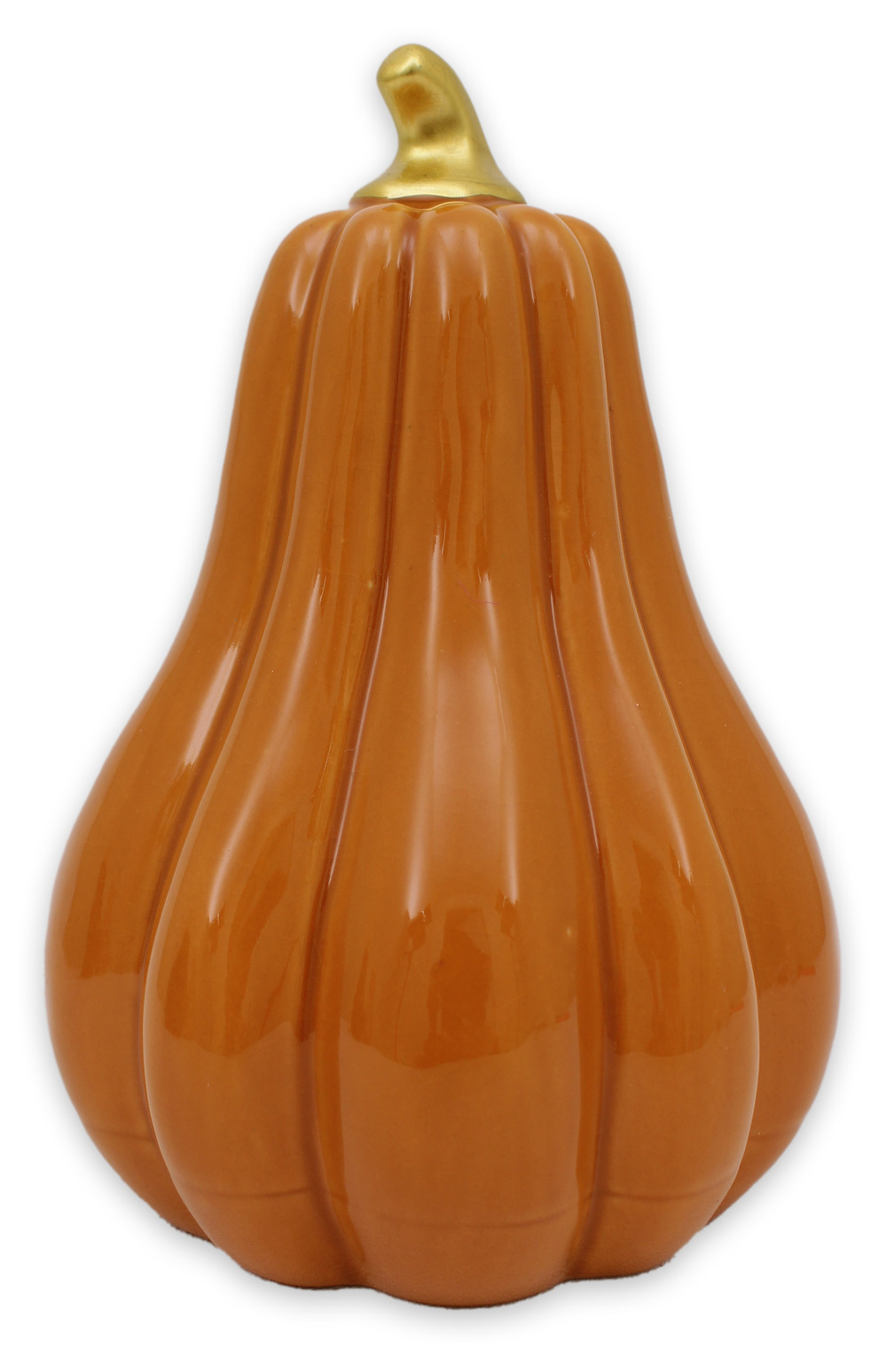 En stilren och dekorativ pumpa i keramik som blir ett vackert inslag i höst- och halloweenpyntet. Den orangea tonen tillsammans med den guldfärgade stjälken ger ett elegant och varmt uttryck som passar både ensam och i grupp med andra dekorationer. Perfekt för att skapa en mysig känsla på bordet, hyllan eller i fönstret.